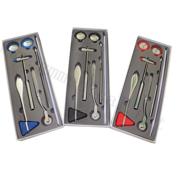 סט כלי פטיש רב-תכליתי לאבחון רפלקס כלי הקשה סט ערכת פטיש לעיסוי נוירולוגי רפואי טיפוח פטיש הרפלקס מכיל 5 פטישי רפלקס שונים: פטיש משולש, פטיש מוט מתכת ארוך, פטיש מוט מוט ארוך, פטיש בצורת T, האמר גלגל פטיש.